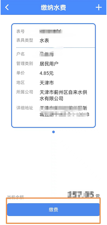 進(jìn)入繳納水費界面,如果綁定了多塊水表,左右滑動選擇要繳納水費的表具后點擊繳費按鈕。如圖
