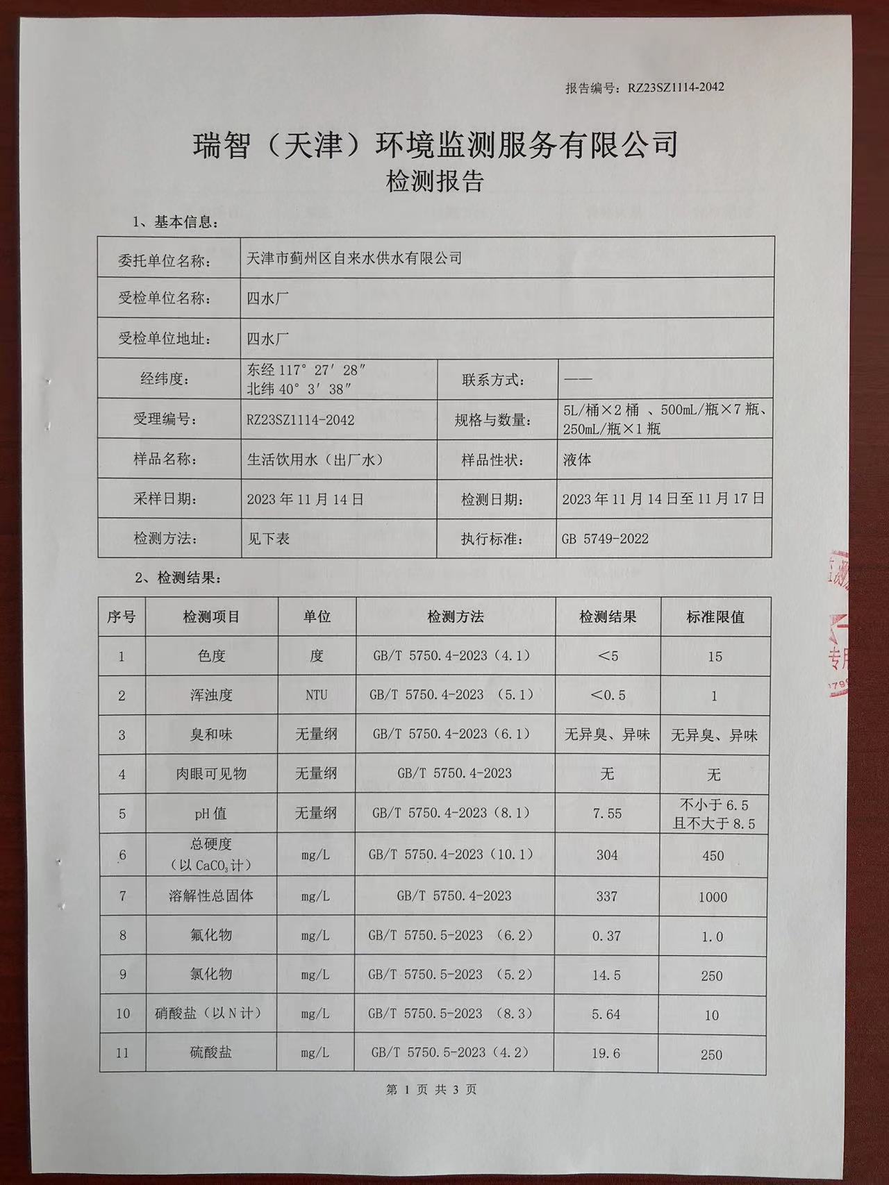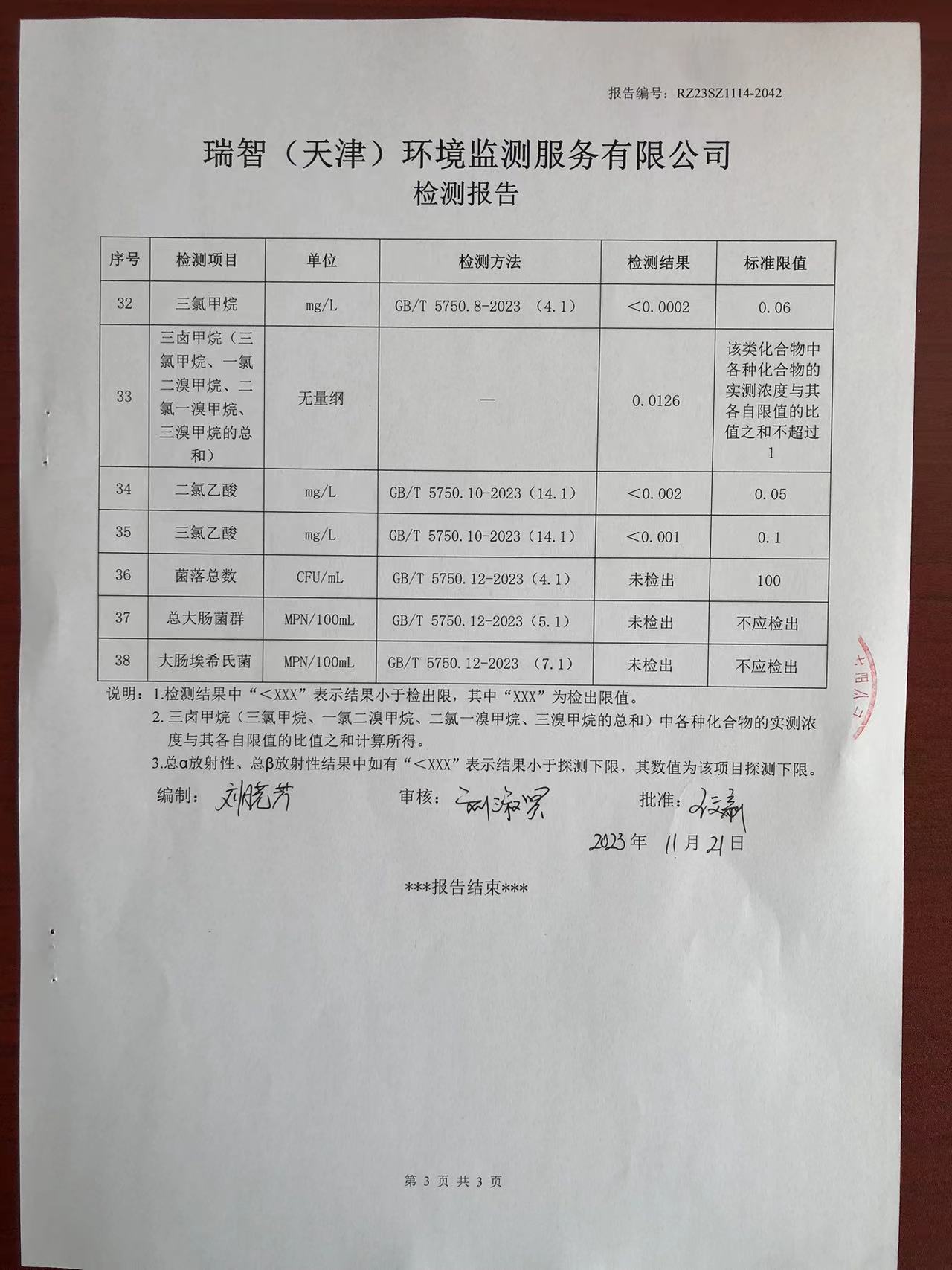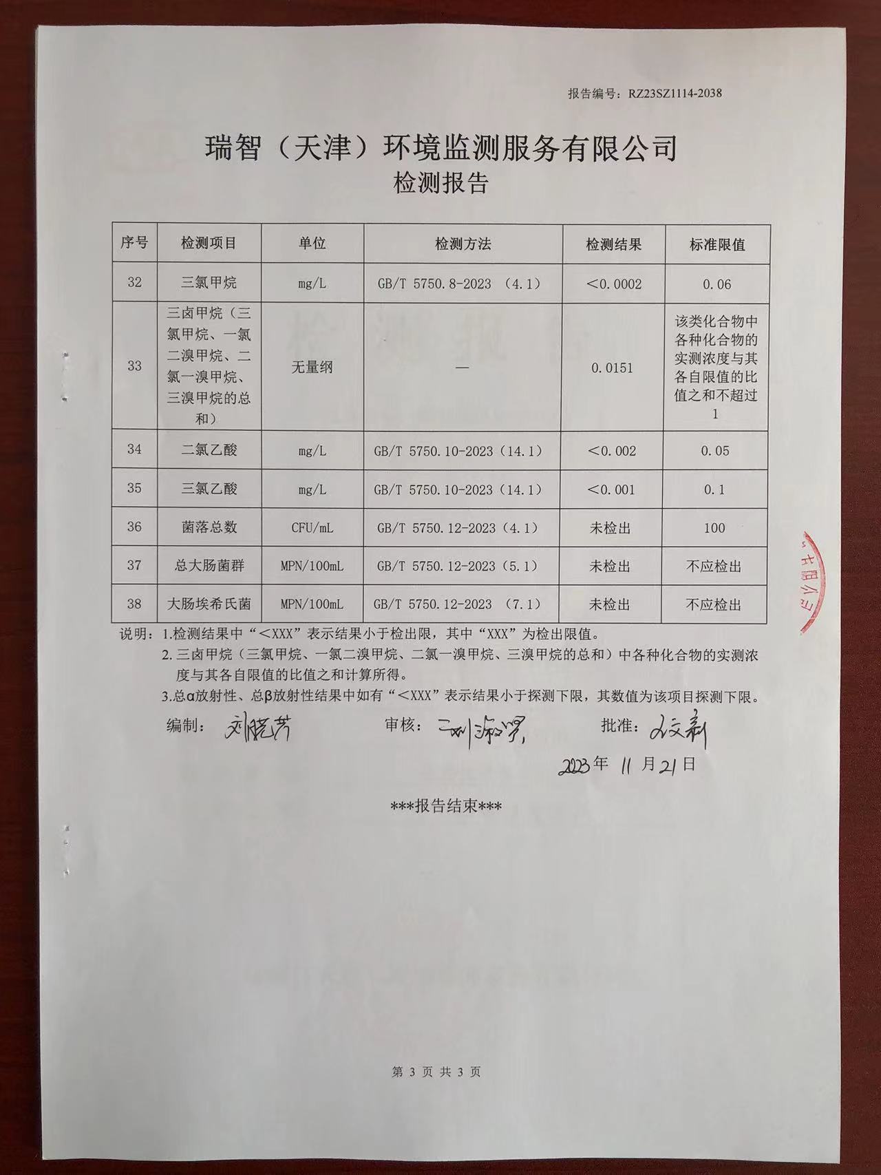 2023年11月份水質(zhì)檢測(cè)報(bào)告