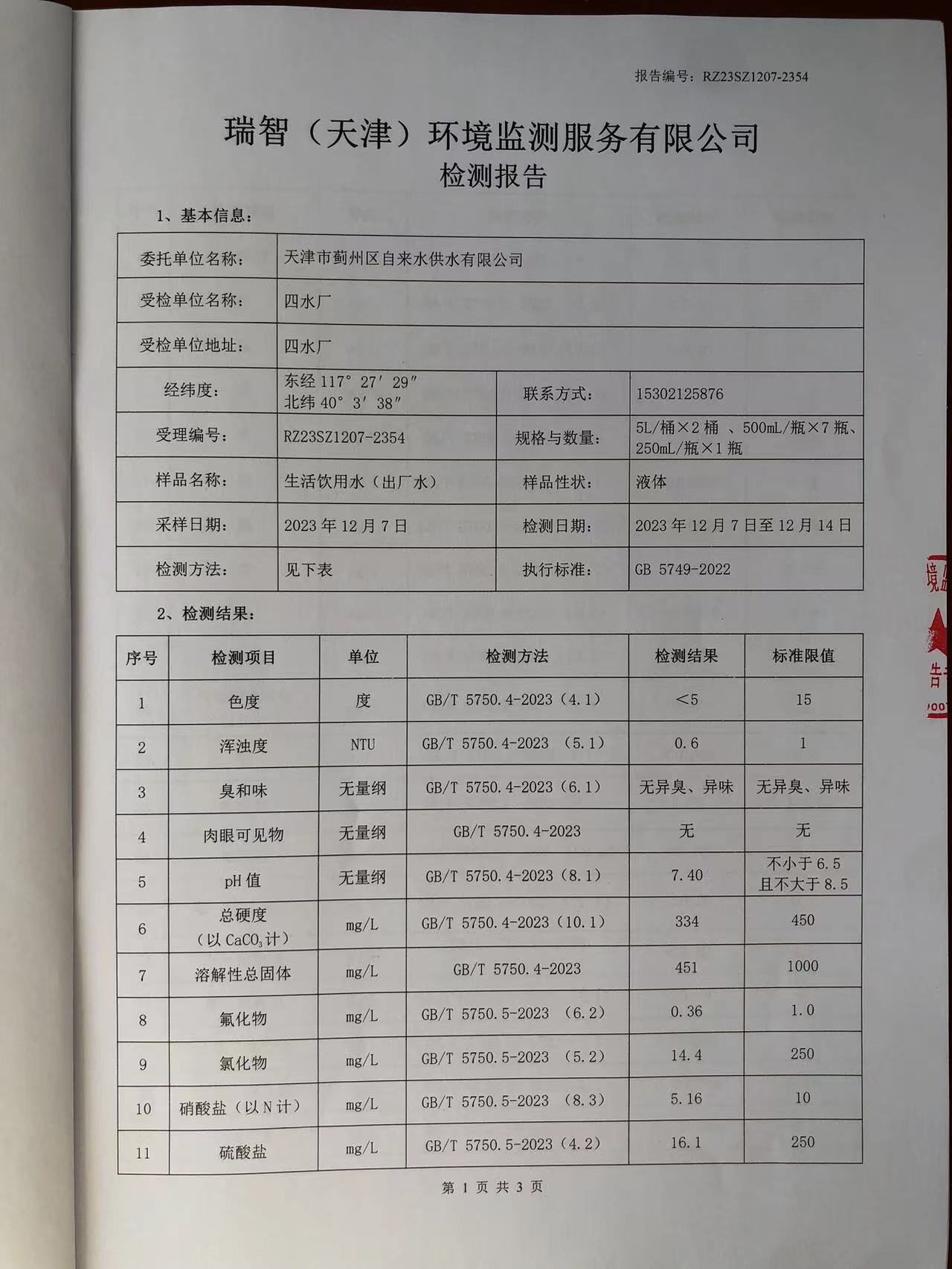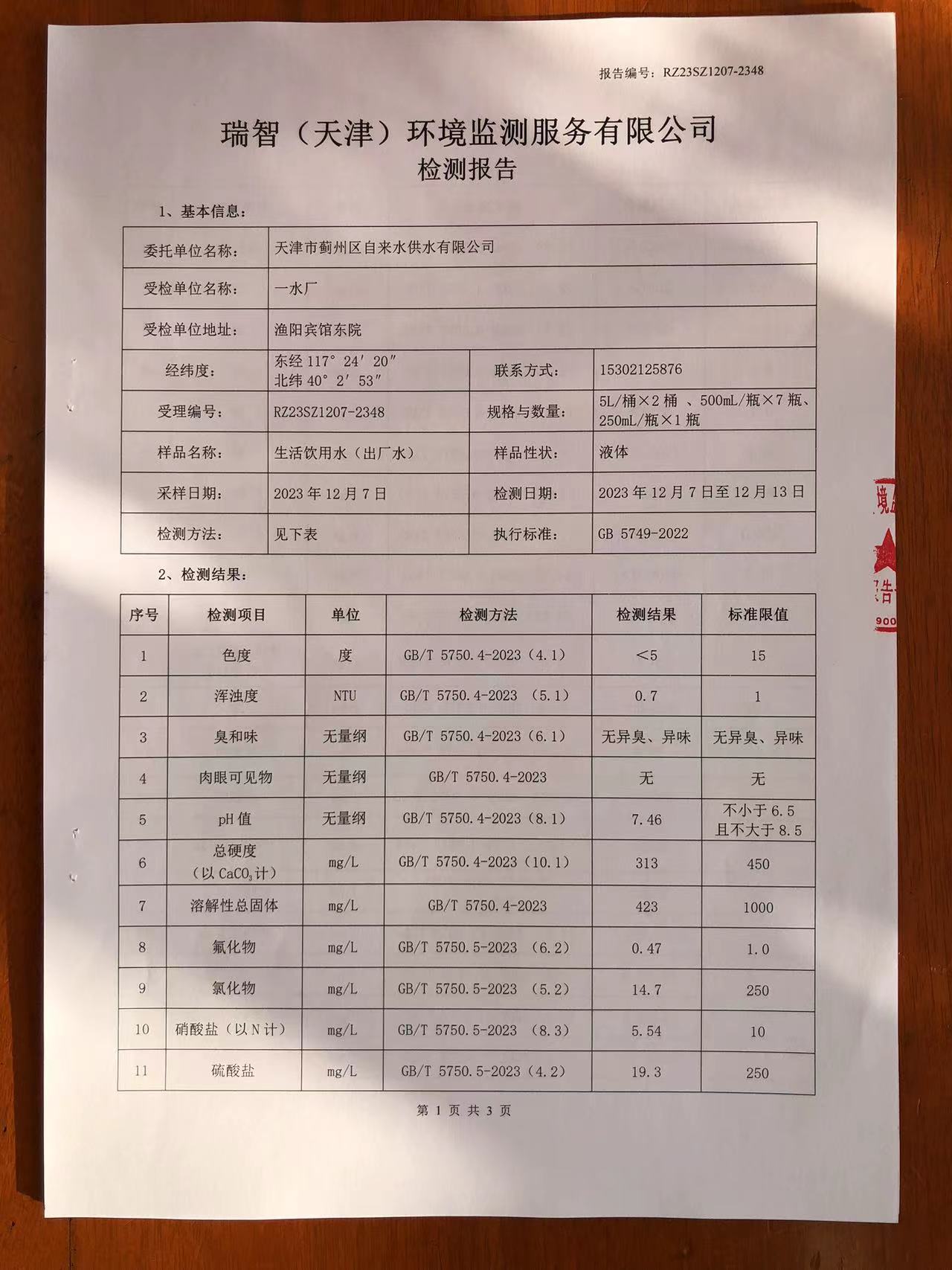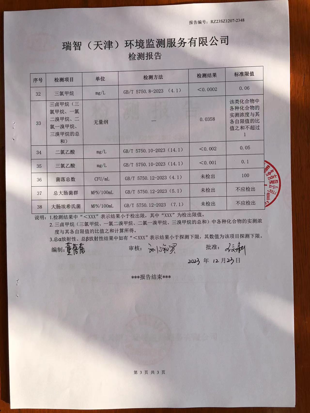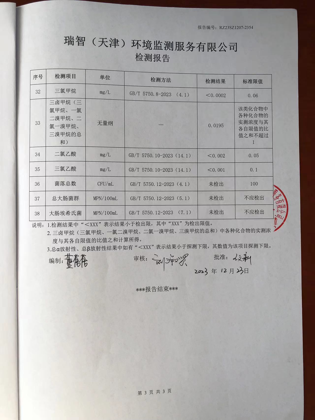 2023年12月份水質檢測報告