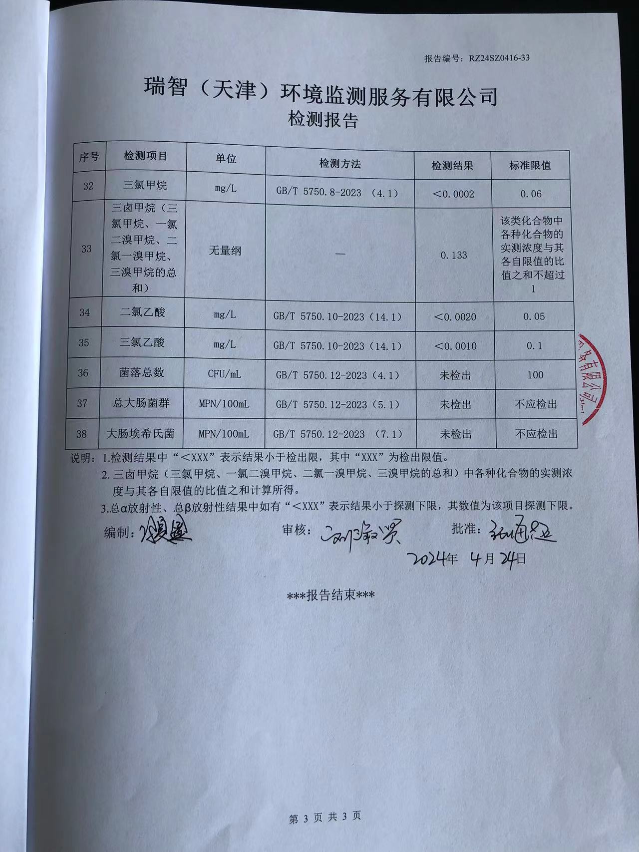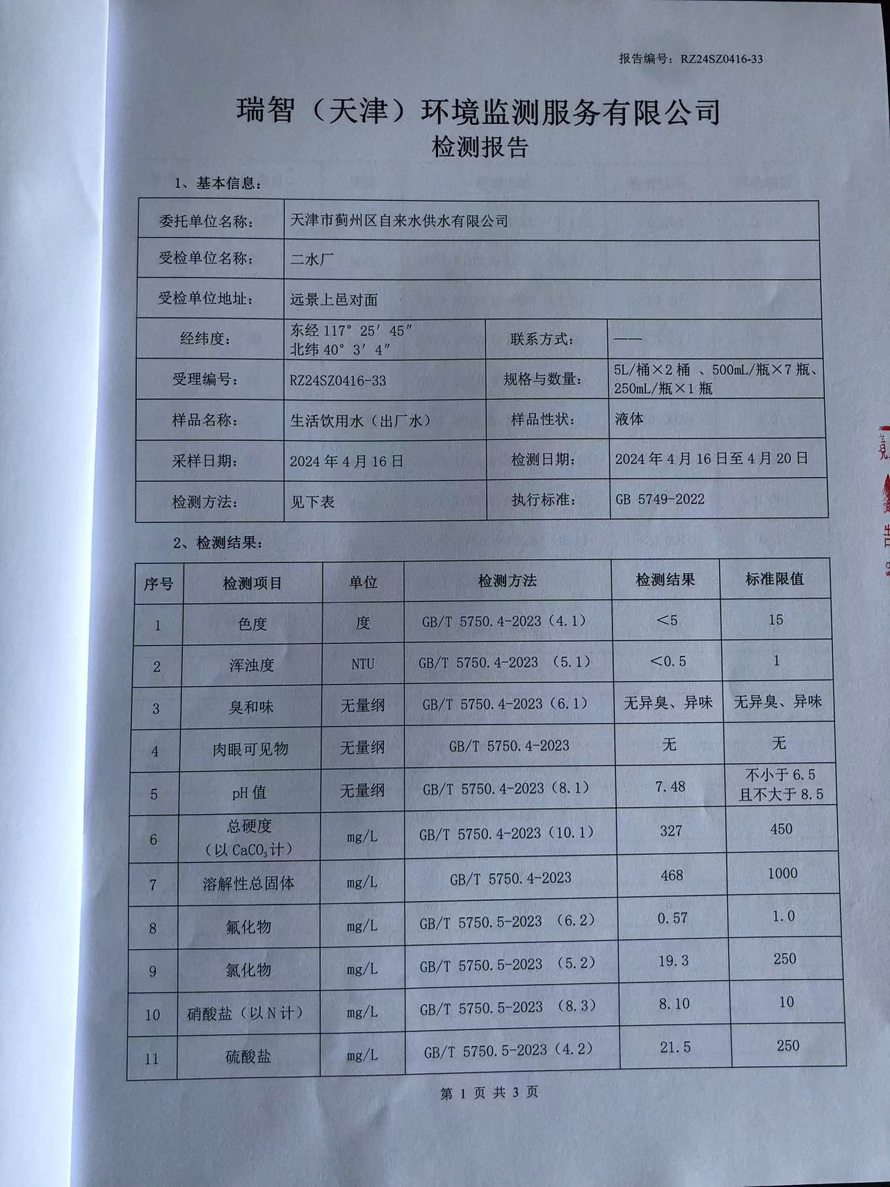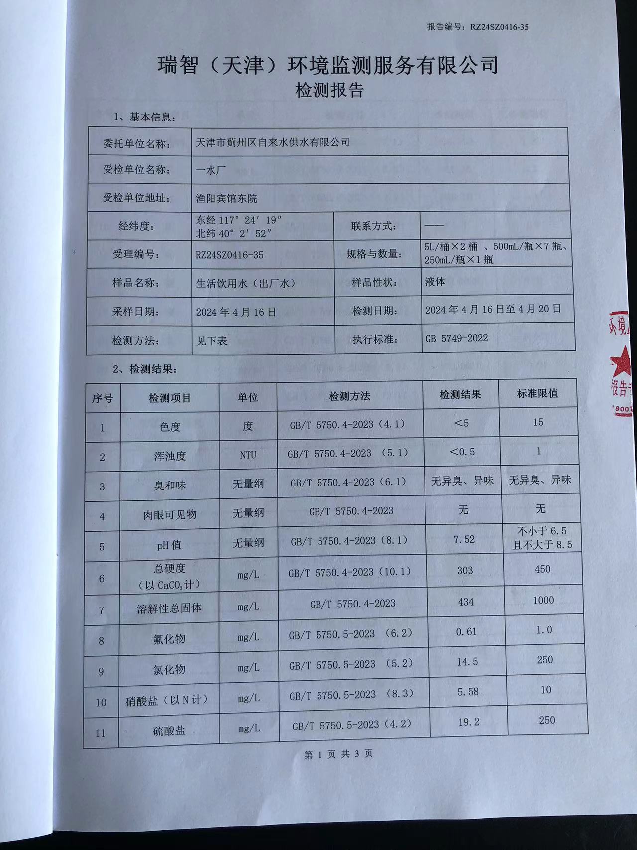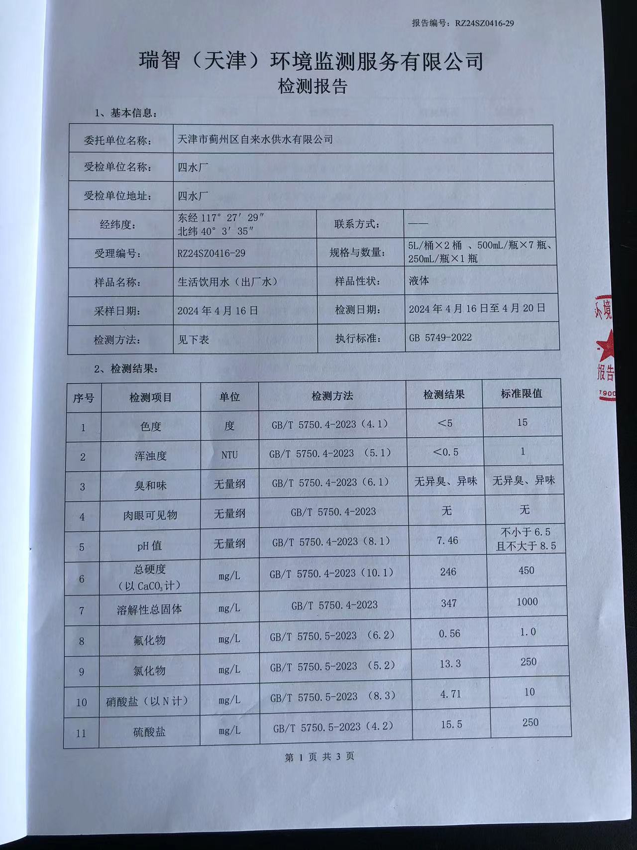 2024年4月份水質(zhì)檢測報(bào)告
