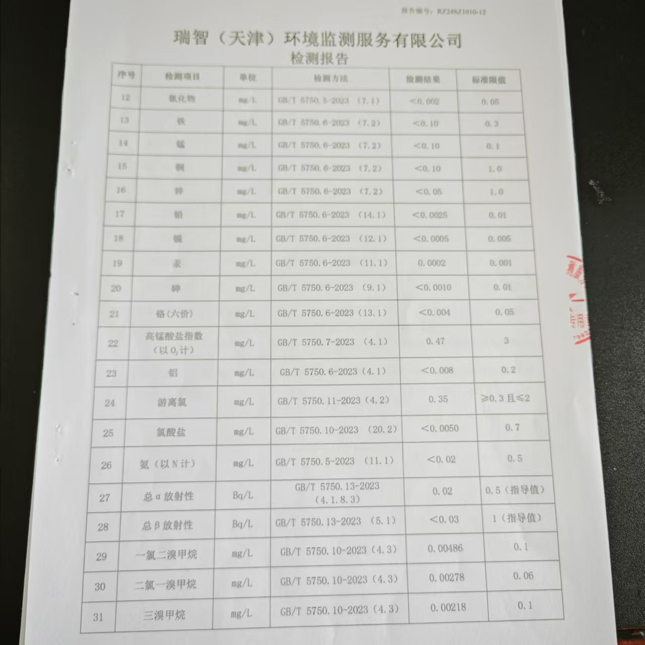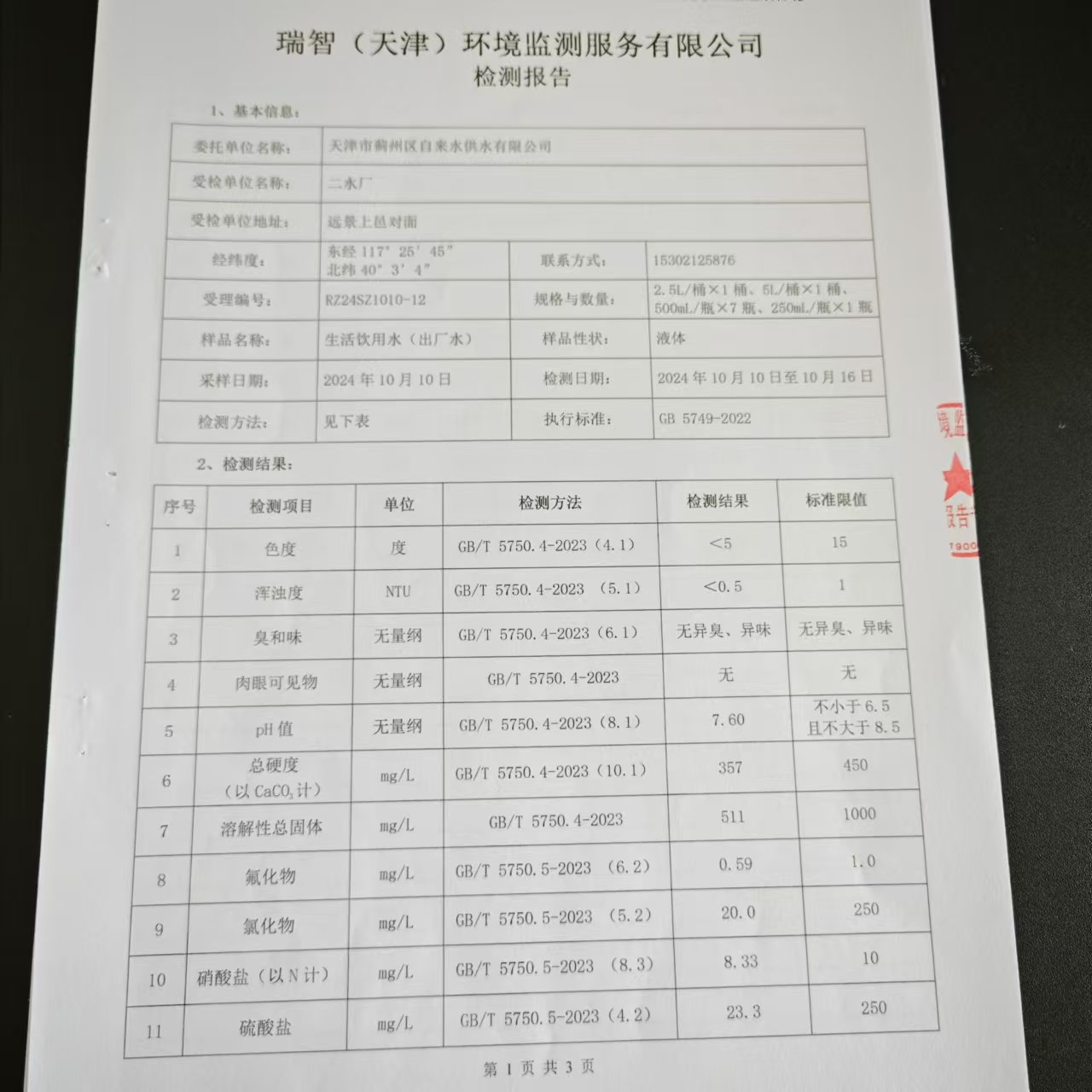 2024年10月份水質(zhì)檢測報告