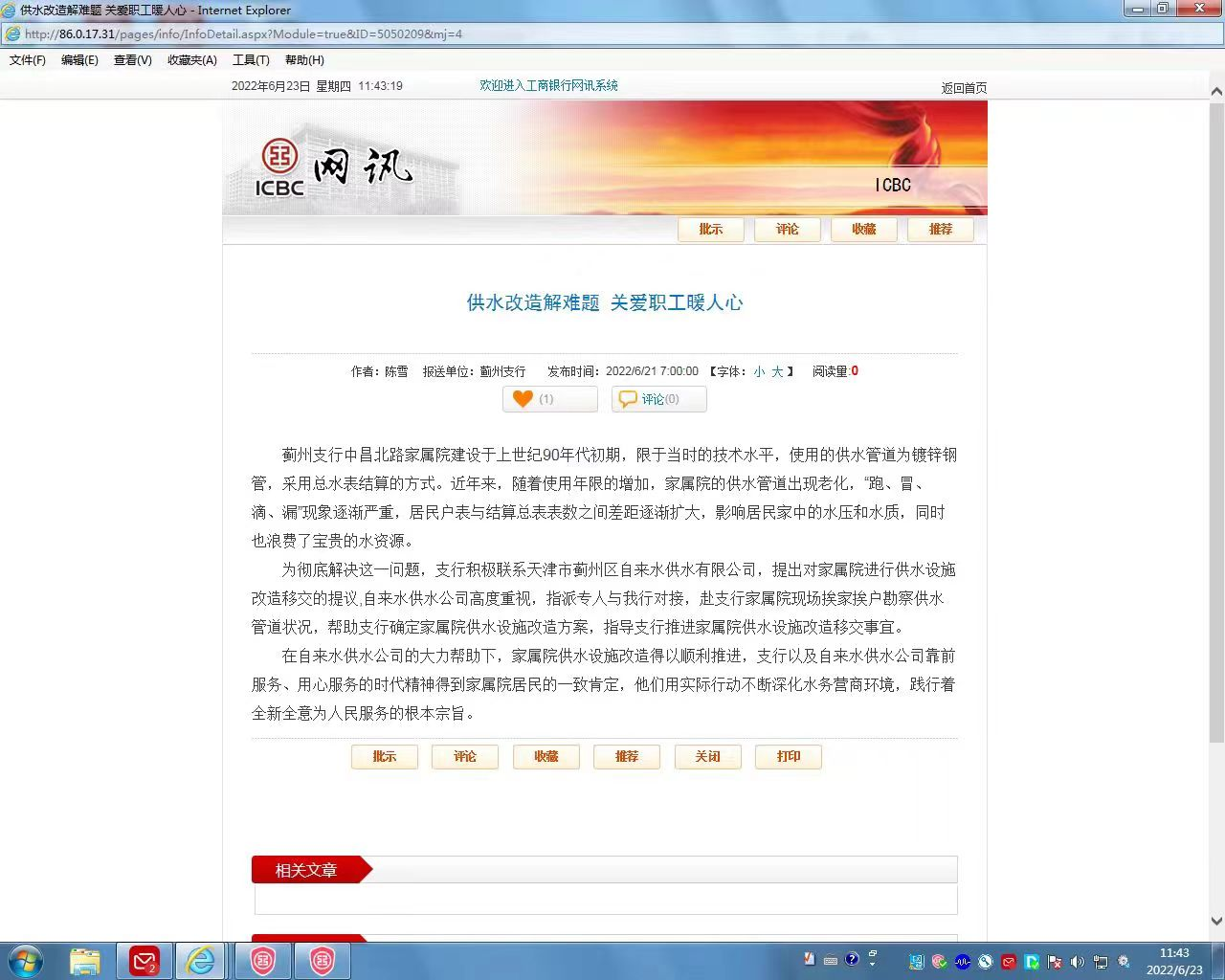 為徹底解決工行家屬院的供水問題,工商銀行天津市薊州區(qū)支行聯(lián)系我公司提出對家屬院進(jìn)行供水設(shè)施改造移交的提議。我公司高度重視,立即指派專人與工行對接,向工行工作人員耐心講解相關(guān)政策及辦理流程。主動赴工行家屬院現(xiàn)場挨家挨戶勘察供水管道狀況,幫助工行確定家屬院供水設(shè)施改造方案,指導(dǎo)工行推進(jìn)家屬院供水設(shè)施改造移交事宜,使工行天津薊州區(qū)支行家屬院改造實現(xiàn)了“零資料”和“零跑腿”,用實際行動踐行全心全意為人民服務(wù)的宗旨,獲得了工商銀行的認(rèn)可。工商銀行于2022年6月21日在工商銀行網(wǎng)訊系統(tǒng)以“供水改造解難題 關(guān)愛職工暖人心”為題對該家屬院改造的相關(guān)情況進(jìn)行了刊登報道。